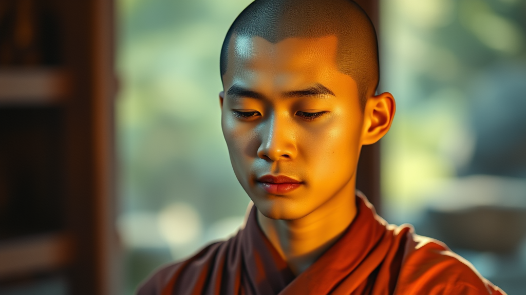 a realistic portrait of a serene and beautiful young zen monk, glowing with inner peace, captured in 8k resolution with cinematic lighting, utilizing a 35mm f1.4 lens for a soft depth of field effect, inspired by the rich tones of fuji color film, subtle artistic modifications add a unique touch to the composition while maintaining the essence of tranquility and contemplation
