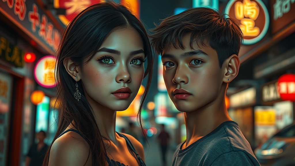 A realistic portrait of a strikingly beautiful young girl and boy, reminiscent of supermodels, standing face to face in an Asian market backdrop. The scene is alive with vibrant shop neon signs and the enchanting glow of night city lights. Both have captivating green eyes, their full bodies depicted with photo-realistic detail showcasing perfect fitness, long legs, and symmetrical faces. Her expressive doe eyes are enhanced by delicate makeup and adorned with charming freckles and high cheekbones. Her long, flowing hair resembles an elegant ink-like cascade. The boy, equally compelling, stands with an enigmatic, melancholy expression. The atmosphere is vivid, captured at an aperture of 1.8 with a dreamy bokeh effect and subtle lens flare. The entire composition is ultra hd, hdr, in 8k resolution, with cinematic lights and extraordinary high details, immersing them in an extradimensional scene that's both real and surreal.