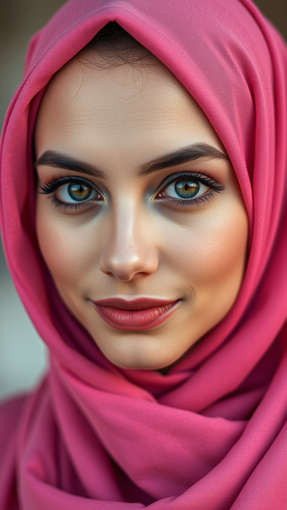 A realistic portrait of a stunning Turkish Muslim woman wearing a pink hijab, featuring a beautiful face with cute pink lips and romantic, captivating eyes. The image is a full head portrait with unzoomed framing in 8k quality, showcasing high definition, depth of field, and clear focus under natural lighting.