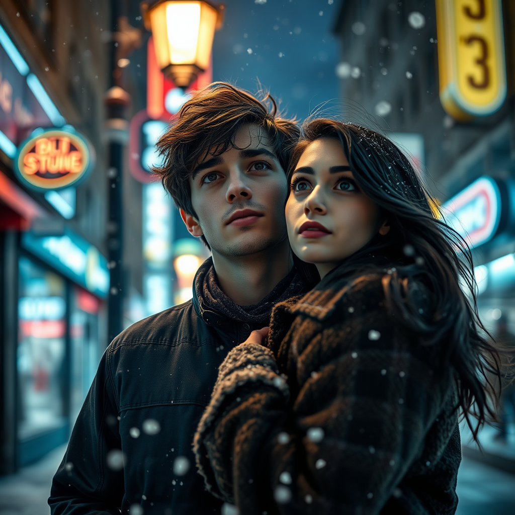 A realistic portrait of a young man with tousled dark brown hair and deep brown eyes, alongside a young woman with flowing ebony hair and striking sapphire eyes, standing together at night on a snow-dusted street, huddled warmly under a softly glowing streetlamp, eyes cast skyward. The scene is captured from a distance of about 10 meters, with breathtaking 8k resolution, painted in deep navy and ink tones reminiscent of a cinematic masterpiece. Around them, blurred neon shop signs cast vibrant hues across the night cityscape, while delicate snowflakes cascade gently from above, creating an ethereal atmosphere. Every facet is rendered in exquisitely high detail, with ultra HD clarity, enhanced with HDR and sophisticated post-processing. The lighting is dynamically crafted, evoking the distinct feel of a high-end cinematic photograph, an immersive experience framed in ultra-high resolution that captures the intimate serenity within the bustling city, enhanced by the dreamy snowfall and the glow of distant marquees.