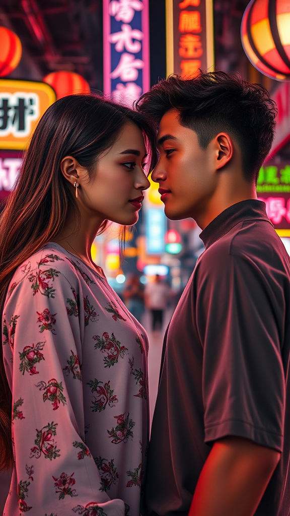 A realistic portrait of an extraordinarily beautiful young woman and a handsome boy standing face to face, both resembling supermodels with an aura of romance. Set against the vibrant backdrop of a bustling Asian market illuminated by colorful neon signs and the enchanting glow of night city lights, their mesmerizing green eyes lock in an intimate gaze. Captured in a full-body photo, the girl exudes elegance with her perfect fitness body and long, graceful legs, complemented by her symmetric, flawlessly striking face. Her expressive doe eyes mirror a blend of melancholy and intrigue, enhanced by delicate freckles that accentuate her high cheekbones. The girl's long, flowing hair cascades like ink, while her subtle makeup enhances her natural beauty. The scene is shot with aperture 1.8, creating a captivating bokeh effect and gentle lens flare, with the cinematic lights further amplifying the ultra-HD, HDR, 8k details. Embracing extradimensional elements, the ambiance and the details in this moment are perfectly heightened by the lively atmosphere of the vibrant market lights.