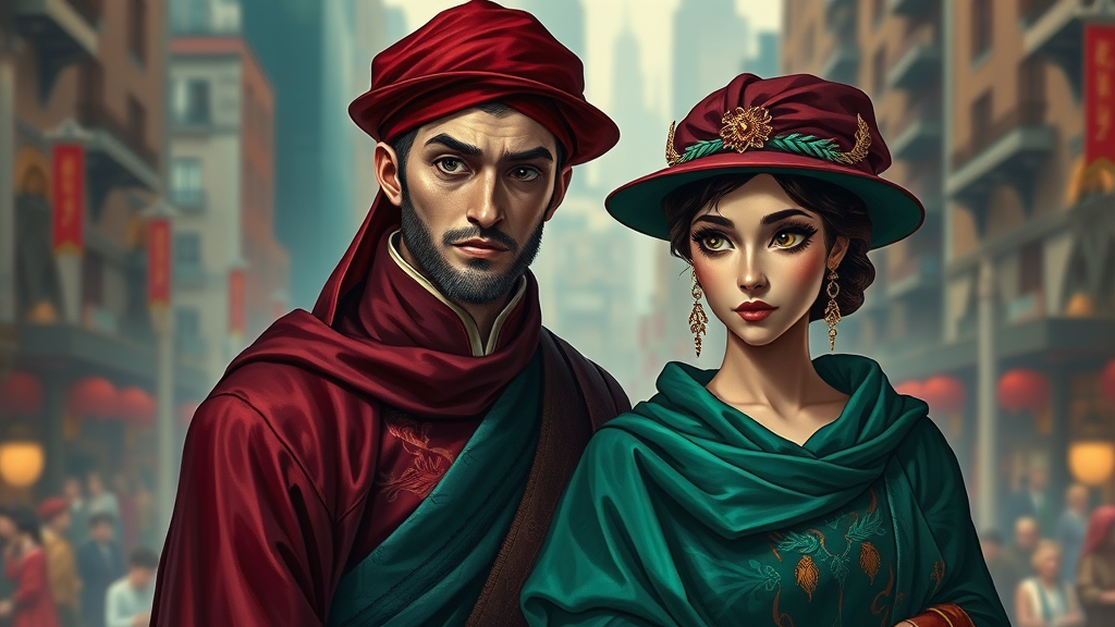 A realistic portrait of two characters depicted with cloth hats and flowing robes, designed in the style of neo-renaissance, featuring vibrant maroon and emerald hues. Their attire is adorned with intricate avian-themed patterns. The background captures the essence of a bustling cityscape. The characters exude charm and are portrayed with an avian grace, possibly inspired by the dignified presence of birds like owls or hawks, seen through their thoughtful expressions and noble postures. Their eyes are bright with intelligence, and their faces slightly elongated, reminiscent of elegant bird features, adding an enchanting element to the scene.