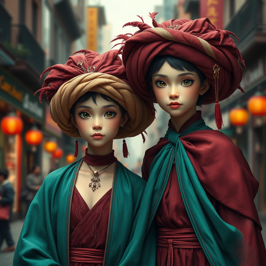 A realistic portrait of two charming characters wearing intricately designed cloth hats and flowing robes, styled as if they were avian-themed figures painted by a neo-renaissance artist. The scene is set in a lively city backdrop, capturing the essence of their surroundings. Their attire is in rich maroon and vibrant emerald tones, blending seamlessly with the background. The figures embody an avian allure, with delicate features reminiscent of birds, their eyes bright and expressive. The use of lighting and texture adds depth, as if crafted in a hyper-realistic style synonymous with the detail of Unreal Engine quality.