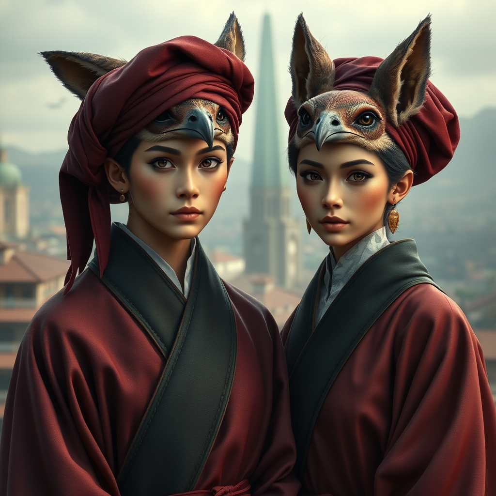 A realistic portrait of two individuals dressed in elegant cloth hats and flowing robes, styled with realistic animal-like features, set against a backdrop reminiscent of a neo-renaissance cityscape. The color palette highlights rich maroon and deep emerald tones, evoking an avian theme with subtle feathered textures. The characters exude charm and grace, their expressions captured with intricate detail akin to lifelike city portraits, carefully rendered in the artistic finesse of unreal engine technology.