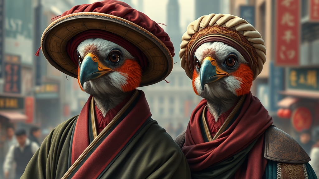 A realistic portrait of two individuals, each adorned in intricate cloth hats and flowing robes, rendered in a style evoking the realism of animal portraits. The colors of maroon and emerald dominate, blending elements of neo-renaissance art with an avian theme. Set against a backdrop of a bustling city, these charming characters capture the essence of graceful birds, their expressions charismatic and lively. The artistic rendering resembles the caliber of an advanced game engine, bringing out vivid textures and details.