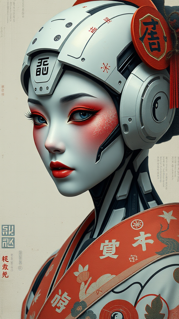 A realistic portrait painting of a futuristic Japanese robotic geisha adorned with intricate kanji symbols and sleek decals, rendered with octane precision in a 4k resolution. The artwork showcases exceptional detail and vividness, reminiscent of visual styles seen in Unreal Engine 5 and cinematic aesthetics of films like Ex Machina and I, Robot. The geisha is intricately designed with attention to detail, emphasizing her advanced robotic features and cultural elements. However, intentional creative distortions introduce visual glitches such as blurred sections, cropping artifacts, unexpected textures, and digital imperfections like JPEG noise. These deliberate anomalies contribute to a unique aesthetic, adding an element of intrigue and duality between perfection and imperfection. Despite these intentional irregularities, the portrait retains its captivating beauty and thought-provoking essence, merging traditional elegance with futuristic design.
