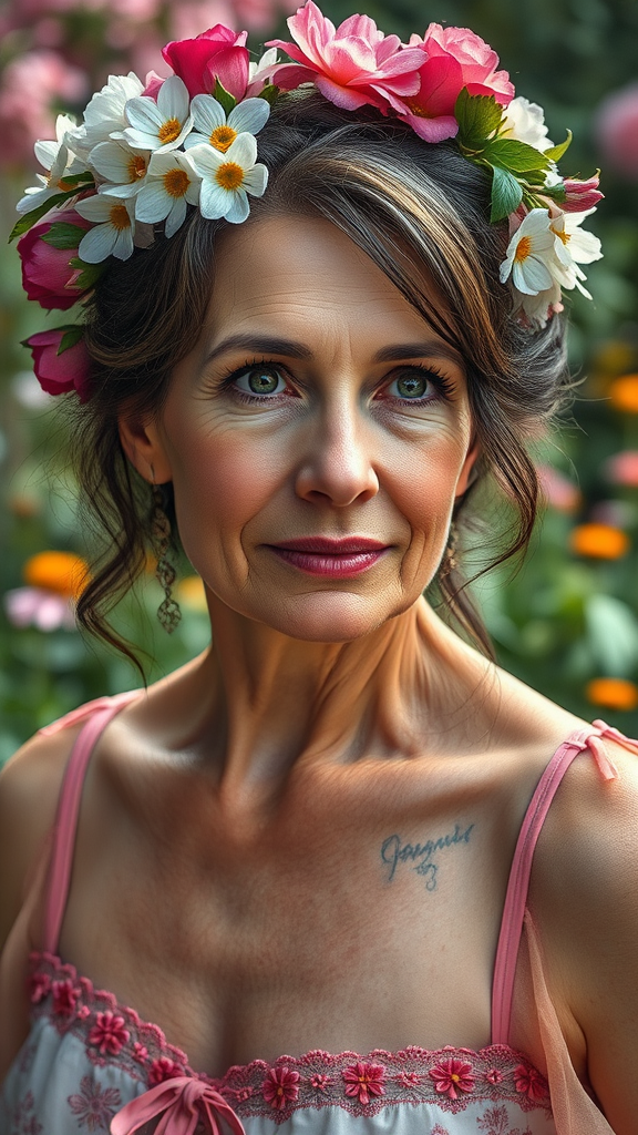 A realistic portrait photo of a 50-year-old large-boned woman with flowers artfully arranged in her hair, set against an enchanting garden backdrop. The image, inspired by Anna Dittmann’s fantasy style and featured on cgsociety, captures the woman in vivid detail from a hip-level angle. This photo, taken with a Cinestill Hasselblad 50mm tilt-shift lens, features soft, dreamlike lighting and showcases hyperrealistic details. Her complexion is matte with visible pores, and subsurface scattering enhances the skin's realistic appearance. The composition adheres to the golden ratio, emphasizing intricate and high-detail storytelling. Despite this being a single-shot masterpiece, it achieves ultra-realistic and best-quality visuals at an impressive 8k resolution. The focus remains on an artistic, hyperdetailed portrayal, avoiding elements like blurred textures, low quality, or unnatural proportions, ensuring a flawless representation without digital distortions or errors.