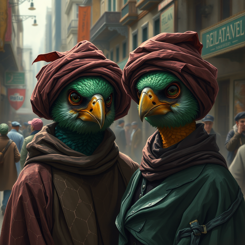 A realistic portrayal of two figures adorned in cloth hats and robes, drawing on elements of neo-renaissance style, featuring maroon and emerald hues. The scene captures a moment in a bustling cityscape, where these avian-themed characters exude charm and personality, reminiscent of a vibrant animal portrait. The atmosphere is brought to life with a touch of artistic elegance, blending historical influences and modern techniques to enhance the visual storytelling.