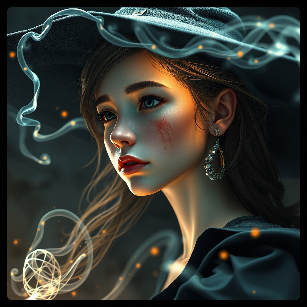 A realistic render of a young female witch with a swirl of magic infusing her, set in cinematic lighting with a volumetric atmosphere and hyperdetailed wires. The witch has earrings and a smudge of dirt on her face. Her nose and long neck are prominently featured. The image is cropped and has a low-resolution appearance, with visible jpeg artifacts. There are elements like text, a signature, a username, and a blurry artist name that suggest a reference sheet. The overall scene evokes a sense of dynamic movement and mystique, maintaining a sense of artistry and detail.