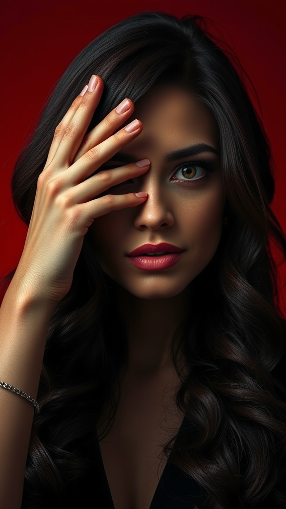 A realistic, ultra-high definition image of a woman gazing thoughtfully, her left hand elegantly covering half of her face, set against a deep crimson background that highlights the intricate details of her expression and adds an air of enigma. Her dark, wavy hair cascades gently over her shoulders, and her eyes, partially veiled by her fingers, convey a sense of introspection and mystery. The seamless blend of shadows and light accentuates the contours of her face, drawing the viewer into the subtle complexity of her emotion. The vertical orientation enhances the presence and allure of her figure, creating a captivating balance between the foreground and the vivid, monochromatic background.