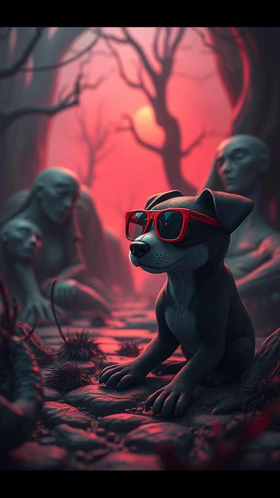A realm of tranquility, silent thoughts in search of understanding, inner nature, demon presence, crimson hue, volumetric lights, atmospheric depth, vibrant and high-resolution style influenced by Bastien Lecouffe-Deharme, featuring elements such as a dog with glasses, ambiguous logos, and blurred visuals. The scene includes subtle imperfections: extra limbs and fingers, distorted forms, grotesque proportions, and unconventional colors. The composition has a surreal, cartoon-like quality with elements of 3D rendering and digital manipulation, resulting in an eerie yet captivating piece, akin to an unusual video game aesthetic.