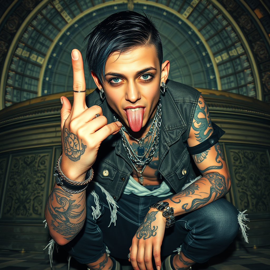 A rebellious street punk in emo-style attire, defiantly holding up the middle finger, eyes locked with the viewer. A young man sporting a sleek bob cut, with a playful glint in his eyes and tongue playfully sticking out between closed lips. He's crouched in a squat, his clothes artfully torn, showcasing an array of piercings and eclectic jewelry. Intricate tattoos snake across his skin, telling stories of defiance and individuality. Set against the backdrop of a grand observatory, the scene is rendered in stunning detail. The background is a masterpiece of intricate design, capturing the viewer's imagination with its absurdly high resolution and extraordinary quality.