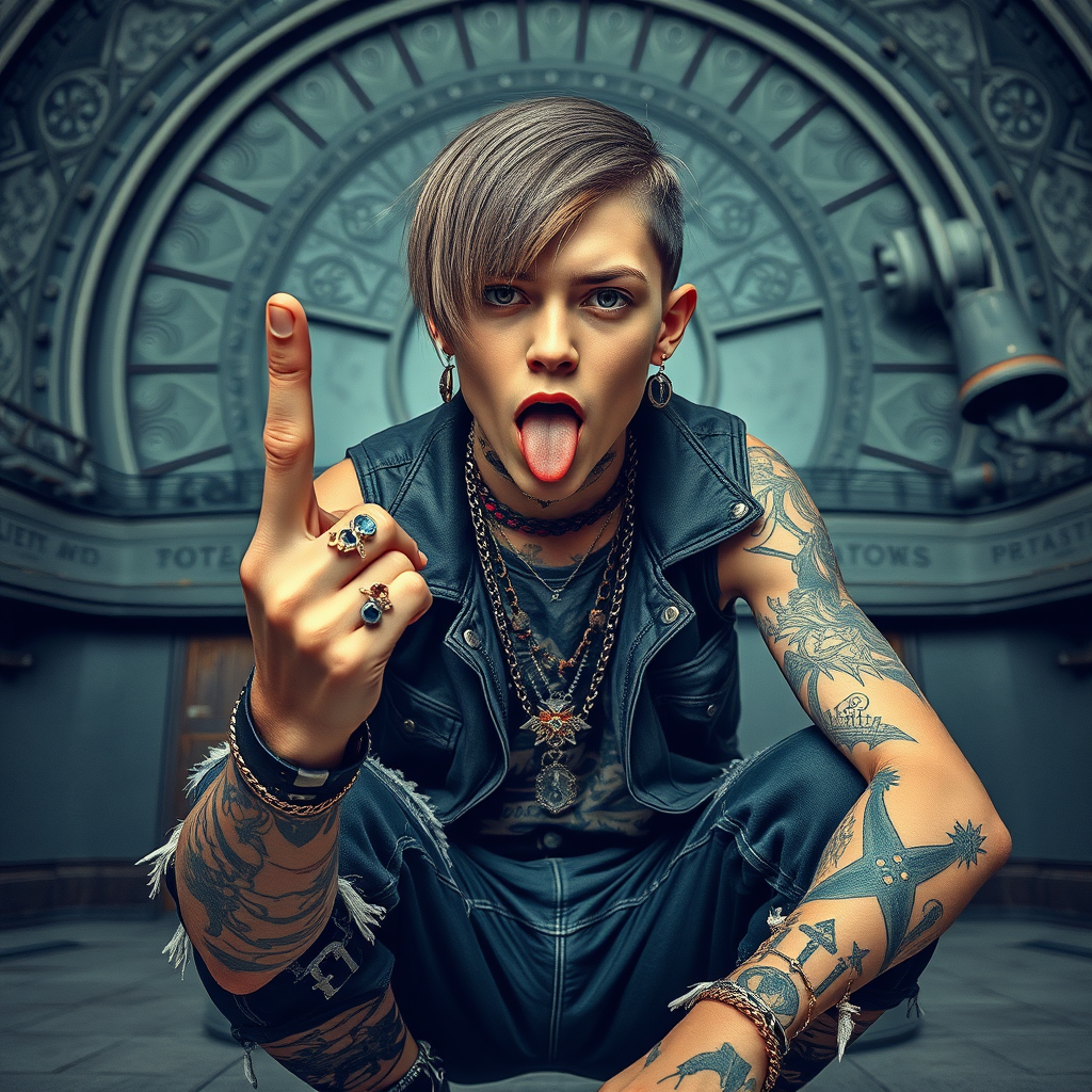 A rebellious street punk in emo-style attire is provocatively holding up a middle finger while gazing directly at the viewer. This boy sports a bob cut hairstyle, sticking out his tongue with a closed mouth. He is squatting, showcasing his torn clothes adorned with various piercings, jewelry, and tattoos. The scene is set against the backdrop of an observatory, featuring an extraordinarily detailed background with intricate designs, capturing an astonishing level of resolution and quality.
