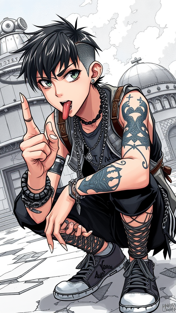 A rebellious street punk in emo-style attire, with a defiant attitude, holds up the middle finger while staring directly at the viewer. The young male sports a stylish bob cut, sticking his tongue out mischievously, yet with a closed mouth. He is squatting down, wearing tattered clothes adorned with numerous piercings, striking jewelry, and bold tattoos. He is positioned in front of an observatory, surrounded by a finely detailed and intricate background that showcases an elaborate setting. The image exhibits a high-resolution, best quality 3D appearance, blending cartoon and anime styles with sketch elements, maintaining a balance of low-resolution and normal quality details.