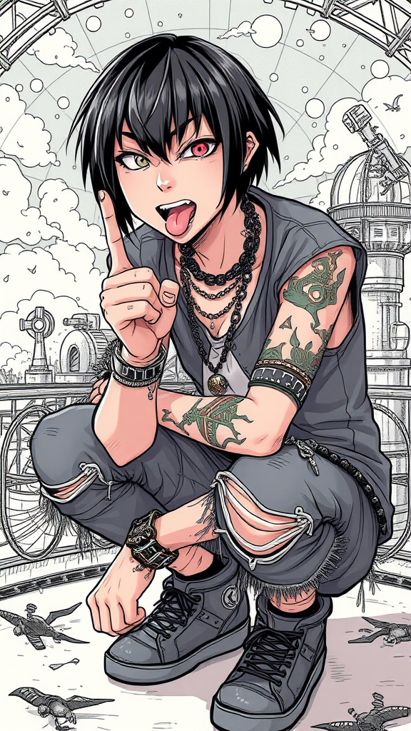 A rebellious street punk with an emo aesthetic, dressed in torn clothes, squatting with a defiant expression. His bob cut hair frames his face as he sticks out his tongue in a cheeky manner, middle finger raised towards the viewer. Adorned with piercings, tattoos, and layered jewelry, he exudes a bold attitude. The setting is an observatory with an intricately detailed background, a surreal mix of cartoon and anime styles. The high-resolution scene captures both the punk’s edgy style and the breathtaking complexity of his surroundings, blending 3D elements with sketch-like textures for an engaging visual effect.