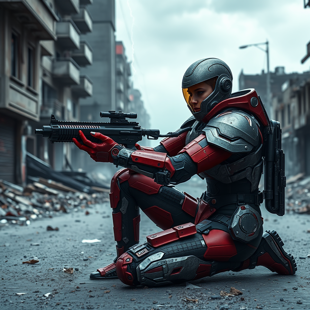 A red-armed female figure clad in intricate sci-fi battle armor kneels on a crumbling city street, aiming intently. Her cybernetic helmet, featuring a sleek design, includes a visor that highlights her focused gaze. The bald head beneath the helmet adds to her formidable appearance. In her hand, she wields a futuristic weapon, aimed with precision. The armor, resembling a spacesuit, is adorned with an array of finely detailed plates, each bearing marks of wear and tear. The scene is enveloped in an overcast ambiance, casting a soft, natural light over the scene, accentuating the photorealistic textures of the setting. A moody lightning effect enhances the ruined urban landscape, with natural blur adding depth. The composition is cinematic, captured from a third-person perspective with expert use of long exposure to emphasize movement and tension. The rendering is of the highest quality, delivering an 8K Ultra-HD experience with advanced ray tracing and cinematic lighting, capturing the essence of a sci-fi movie style.