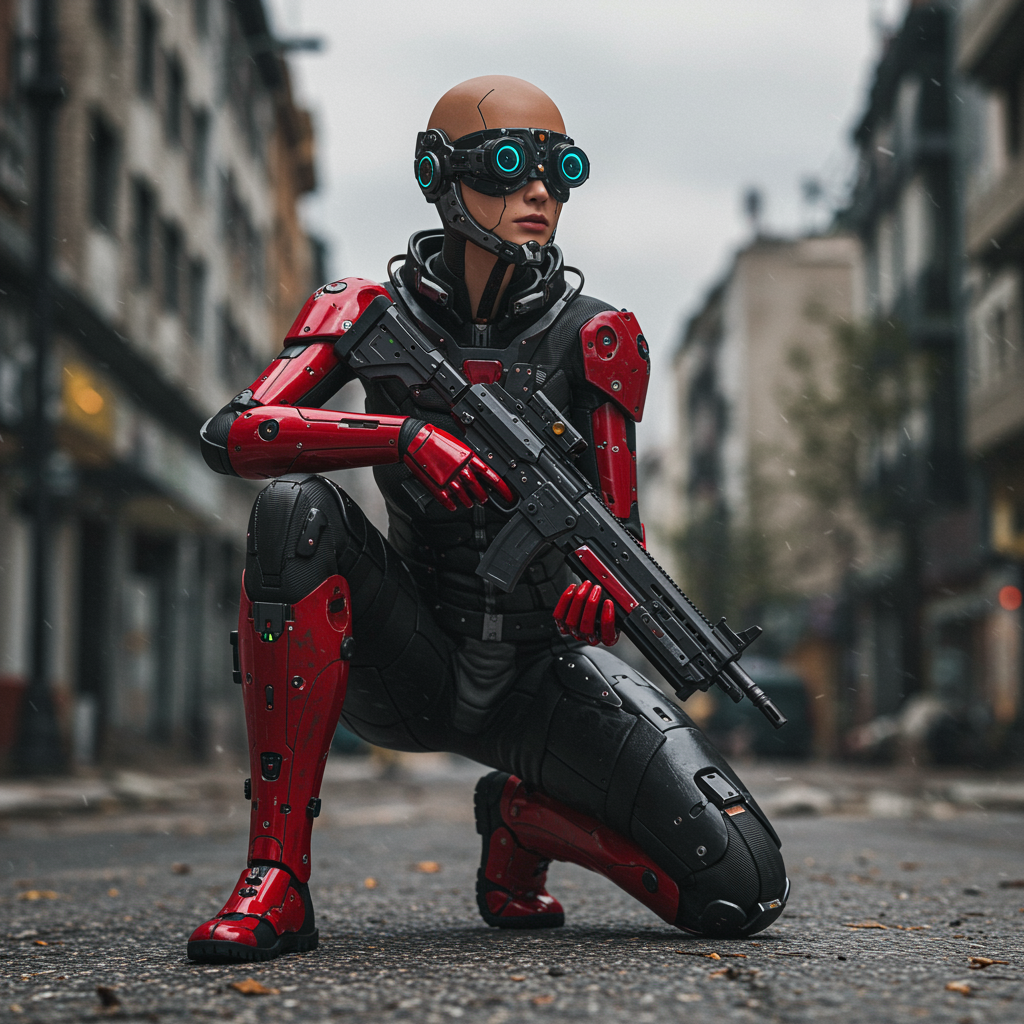 A red-armed female figure crouches on one knee in a ruined city street, donning futuristic battle armor with intricate details. Her cybernetic helmet glimmers under the overcast sky, integrating a high-tech visor that covers her eyes. The figure's bald head reflects the natural lighting, enhancing the photorealistic quality of her appearance. An elegant mask adorns her face, and she holds a weapon with precision, poised and ready. Her armor resembles a sophisticated spacesuit, covered in numerous small details that evoke the sci-fi movie style. The setting boasts natural textures and light, creating a moody, cinematic ambiance. Utilizing ray tracing for the highest quality, the scene captures long exposure blurring the background, rendering in 8K Ultra-HD. The image exudes a cinematic feel from a third-person perspective, with natural and cinematic lighting sharpening the focus on the armed figure amidst the destroyed urban environment.