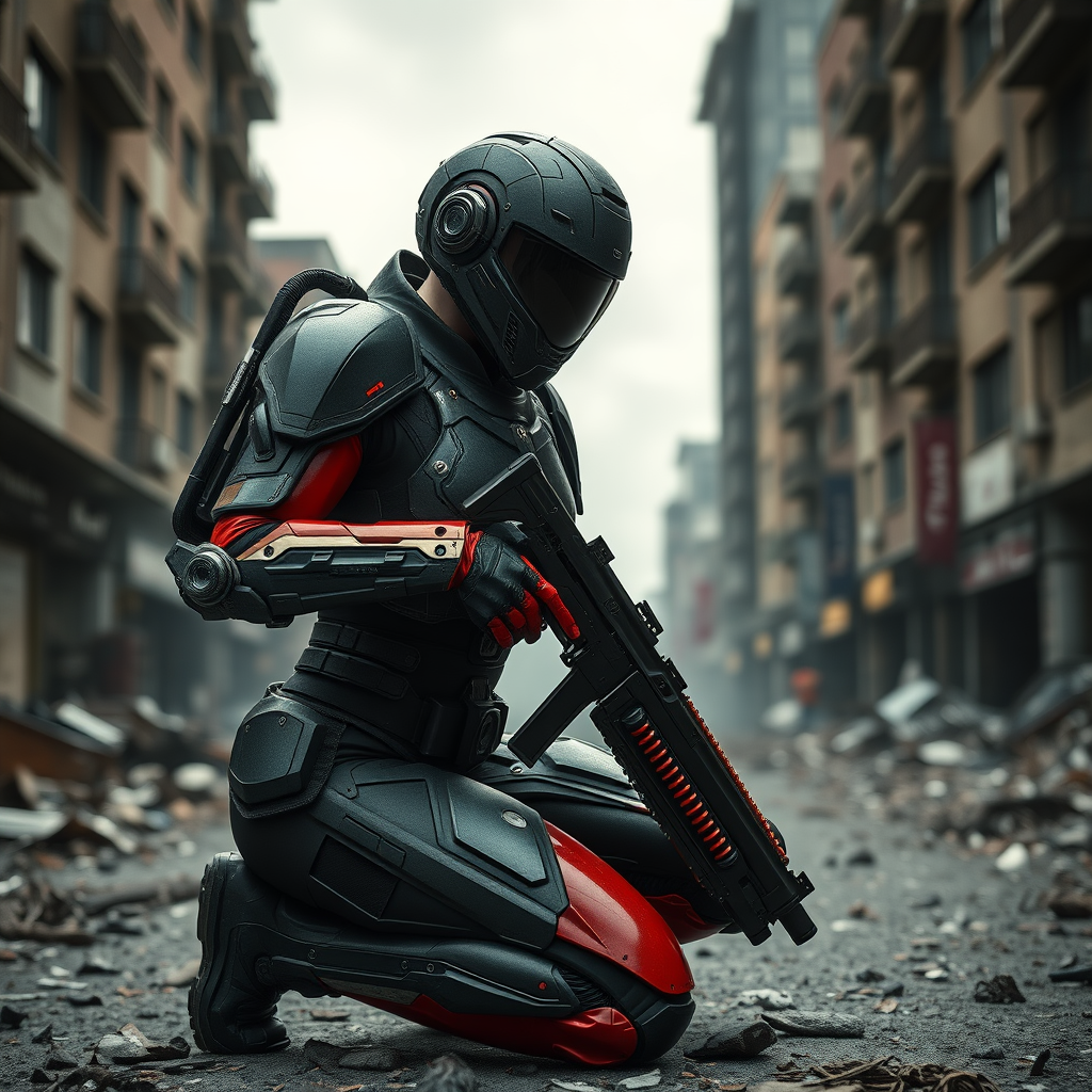 A red-armed female figure in futuristic battle armor, featuring a cybernetic helmet and high-tech visor, kneels purposefully on one knee. Her bald head is smooth beneath the intricate mask that hugs her features. Clad in sleek, isolated plate armor that resembles a sophisticated spacesuit, she grips a powerful weapon, poised and ready. The armor is densely detailed with intricate designs and textures, blending seamlessly with the tech aesthetics of a sci-fi movie scene. She is positioned amid the ruins of a shattered city street, under an overcast sky that casts moody, natural lighting across the scene. The photograph captures the essence of cinematic realism, employing photorealistic techniques, ray tracing, and meticulous use of natural textures. Set in a third-person view, the image employs subtle blur effects and long exposure to enhance its dynamic quality. Rendered in 8K Ultra-HD, the scene exudes cinematic lighting, evoking a sense of tension and intrigue in its atmospheric composition.