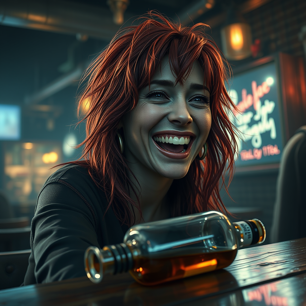 A red-haired woman with disheveled tresses sits at a gritty bar, her laughter echoing through the dimly lit room as she winks drunkenly; a toppled whiskey bottle lies beside her. The digital painting captures a hyperrealistic, cinematic scene in Unreal Engine 5, with intricate details visible in her expressive eyes. This gritty, detailed artwork showcases a closeup of her face, rendered with HDR and octane precision. The atmosphere conveys a sense of raw authenticity, mingling chaos with realism amidst a setting reminiscent of an urban totem pole of blurred anatomy and surreal, disjointed forms.