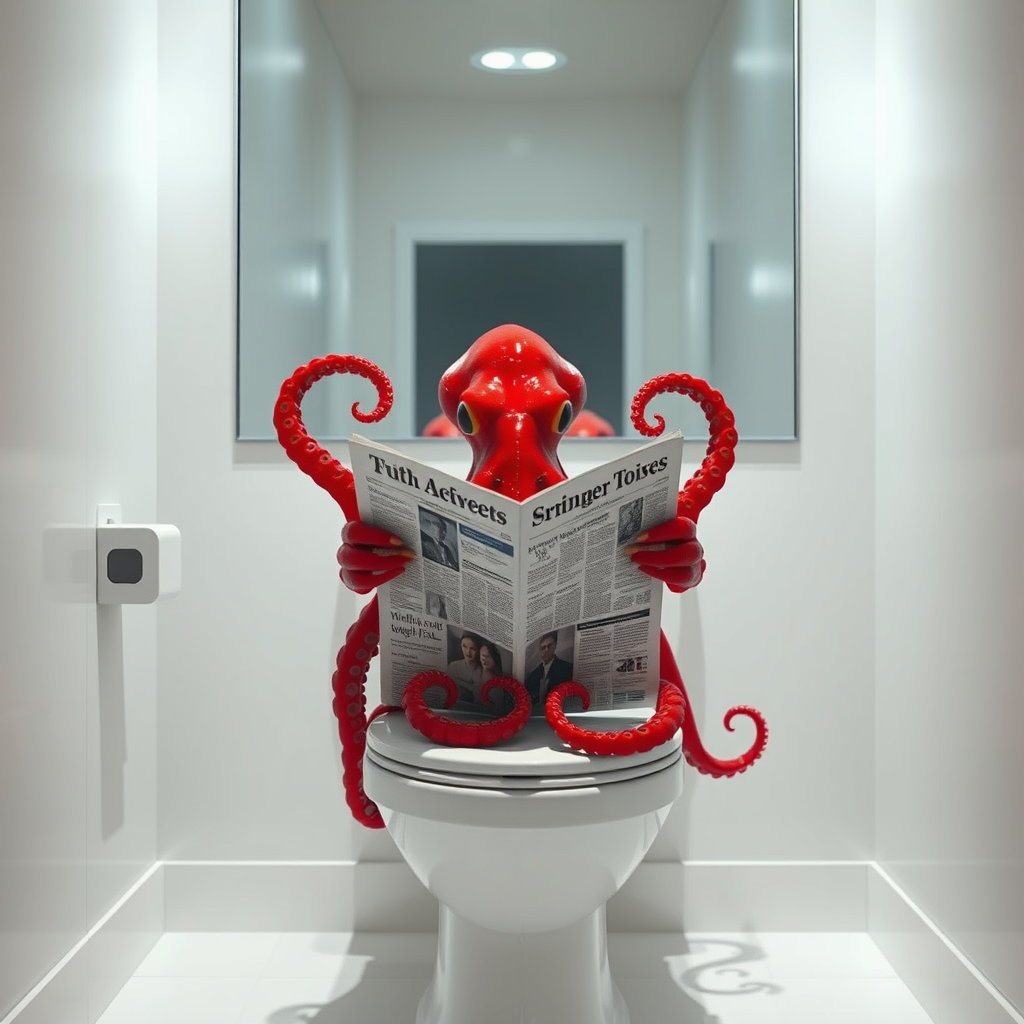 A red octopus sits on a toilet, with glossy tentacles casually holding a newspaper, surrounded by a serene ambiance of white tones. The white walls and a mirror behind reflect its unique silhouette, while subtle LED and glow lights provide cinematic lighting, emphasizing the hyper-realistic, highly detailed scene. The environment is devoid of dark tones, enhancing the purity of the space in a 2:3 aspect ratio.