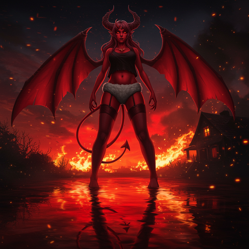 A red-skinned demon girl with twisted horns and wooly underpants stands confidently, styled in a manner reminiscent of the Yuumei artist style. She sports stockings and displays features of gigantism against a backdrop blending anime and manga graphics. Her crimson form is reflected in red water, with her demon wings outlined against the dark silhouette of a burning house. The scene is rich with intricate details, capturing a sense of acceleration and speed. The dark exposure and ambient lighting enhance the drama of this ultra-high-quality, 8K artwork. The view from the bottom adds to her imposing presence in this vivid, nightlit setting.