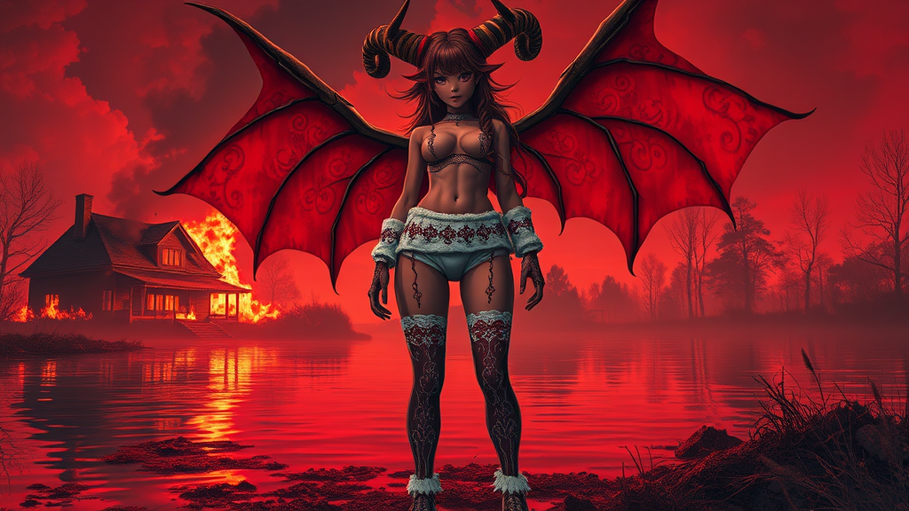 A red-skinned demon girl with twisted horns stands confidently in wooly underpants and intricately designed stockings. Her imposing figure, hinting at gigantism, is captured in a style reminiscent of Yuumei, blending anime and manga graphics. The scene is set against a backdrop of a burning house, casting a dramatic glow on the landscape. Her demon wings unfurl behind her, silhouetted against red water, creating an intense atmosphere. Hyper-detailed elements abound, with ambient lighting highlighting every curve and contour. The perspective is from the ground up, emphasizing her dominance, and the composition boasts Ultra-HD 8K quality with dark exposure and a sense of speed and acceleration.