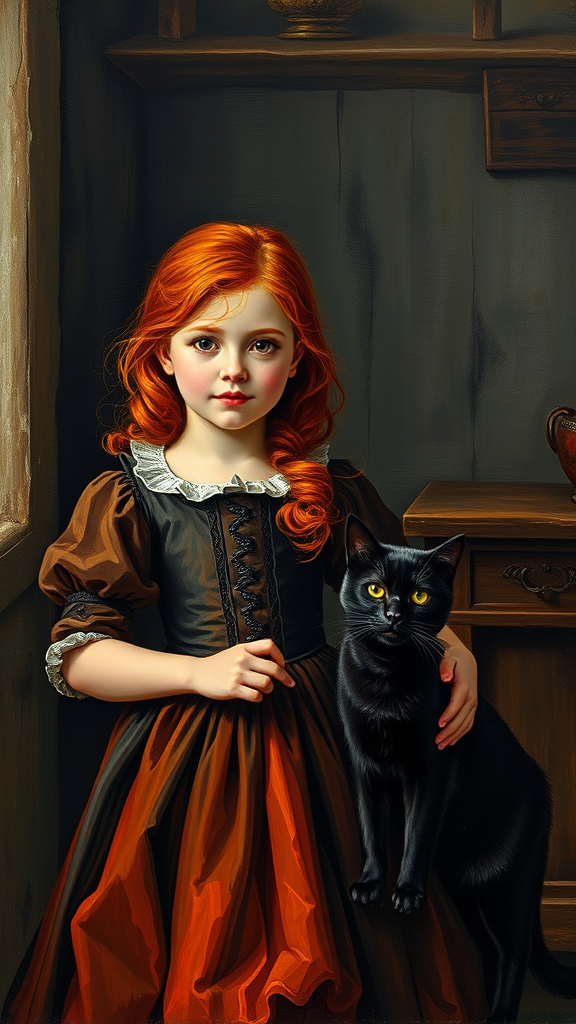 A redheaded girl with a lively demeanor stands alongside her sleek black cat in a painting reminiscent of Vermeer's style, featuring bold colors and thick brushstrokes. She is adorned in a richly detailed 1600s dress, with dark light enveloping her form, swirling lines capturing her vibrant spirit. The scene is set in a quaint, rustic room that captures the essence of its location, the interplay of shadows and light revealing a serene yet dynamic atmosphere. The artwork's vivid palette and deeply textured strokes highlight the personality of the girl and her feline companion, bringing an old-world charm with an infusion of modern energy.