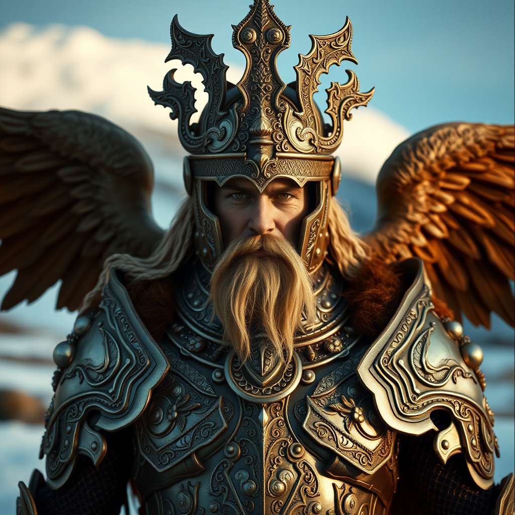 A rediscovered Norse deity, believed extinct for centuries, donned in magnificent intricately designed celestial armor, captured with a Canon D500 on Portra 200 film, RAW format, surrounded by an ethereal Nordic landscape as light glints off the ornate metalwork, exuding an aura of ancient mystique and power.
