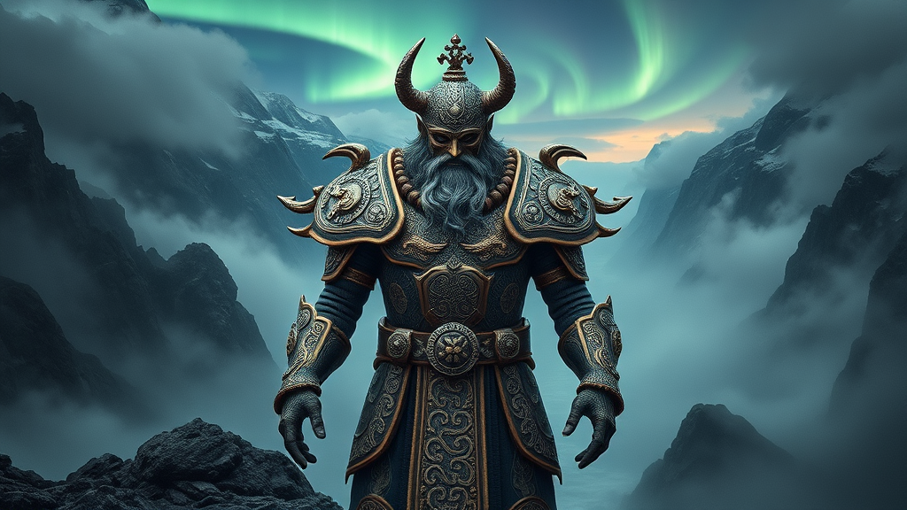 A rediscovered Norse deity, once believed to have vanished eons ago, clad in intricately designed divine armor featuring motifs of ancient runes and mythical creatures, captured in stunning detail with a Canon D500 on Portra 200, RAW format. The god stands amidst a dramatic landscape of towering fjords and swirling mists, their presence commanding the turbulent elements, with a faint aurora illuminating the sky above.