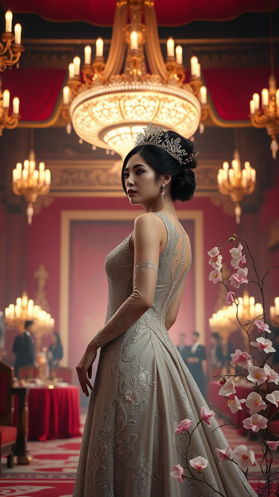 A refined Chineseatroness, styled in a couture evening gown with intricate mahjong-inspired silver embroidery, attends a high-society masquerade gala, set amidst the grand opulence of an ancient Forbidden City throne room, with lavish chandeliers, ornate screens, and crimson fabrics, illuminated by a sumptuous blend of golden candelabras, teardrop crystals, and softbox flashes, landscaped with a fantastical arrangement of jade, orchids, and lotus flowers, rendered in photorealistic detail using Unreal Engine 5's Kraken dynamics and Nanite virtualized geometry, with the subtle warmth and layered nuance of RTX ray tracing, augmented by ambient occlusion, cinematic color grading, and a dab of artistic magic to capture the whispered secrets and ancient mysteries of Imperial China.