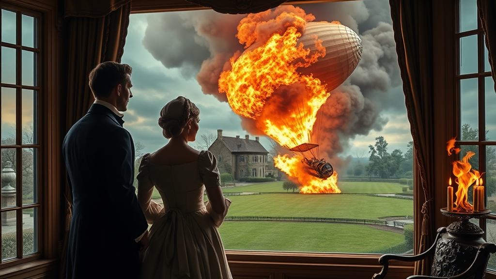 A refined couple, impeccably attired in the finest 1800s fashion, stands statuesque by their grand window, surveying their expansive estate. Their faces project calm and assurance as they silently observe a dire spectacle: a majestic hot air airship, engulfed in flames, spiraling downward to crash with a deafening roar onto their manicured lawn. Despite the chaos, their unwavering poise and dignity are emblematic of their inner strength and resolve. This stark contrast between their composed presence and the fiery calamity outside creates an enthralling scene that stirs the imagination and leaves an indelible mark. The elaborate details of their clothing and the opulent antique decor of the room add layers of depth and richness, while the raging inferno and billowing smoke evoke an urgent sense of danger. The overall scene is a breathtaking fusion of historical sophistication and dynamic action, celebrating the enduring human spirit in the face of catastrophe.