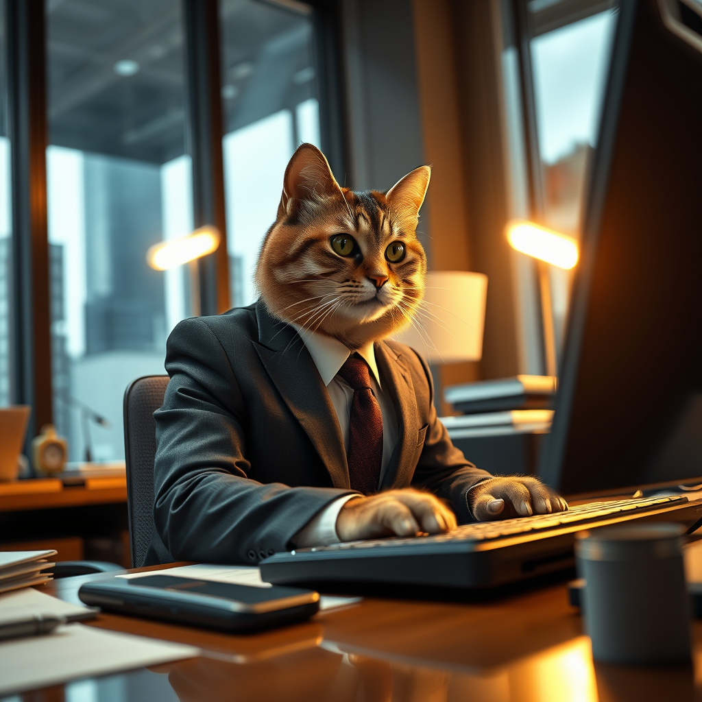 A refined feline is diligently working at an office desk, seamlessly performing tasks as if a human; the scene is captured with photorealistic precision, showcasing intricate details in a masterful composition, in stunning 4k resolution; the perspective captures the cat in a business suit, skillfully typing on a computer, surrounded by office supplies and documents, under a warm, ambient light that adds depth and realism, set against a backdrop of tall windows revealing a cityscape.