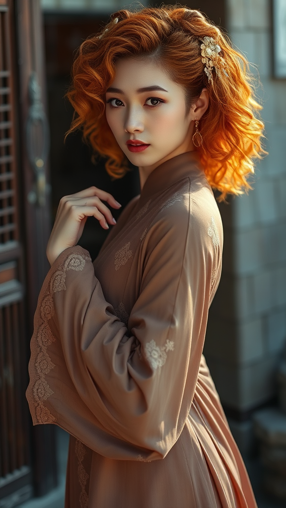 a refined korean imperial beauty with vibrant orange tinged curly hair, hyper-realistic water effects glistening in the shot, adorned in a mori kei eastern inspired fashion atelier ensemble in soft mocha tones with delicate lace details, striking graceful arabesque pose amidst a dramatic rustic hanok setting, with a faint blur and shallow dof to evoke a nostalgic feel, captured with a vintage 50mm manual focus lens treating the sujet as a precious otoku f suiramen forced perspective, slave beauty aesthetic, enthralling dynamic range and emphasized natural lighting to truly supplant setting, sharp eye contact with distinct facial characteristics and flair, enticing poses and demure atmosphere reminiscent of Japanese queen aesthetic