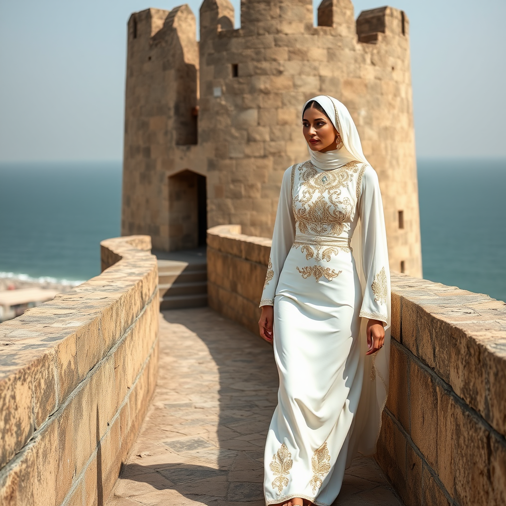 A refined portrait of a woman dressed in a traditional Bahraini Thobe, set against the backdrop of the historic Bahrain Fort. The Thobe is a pristine, ivory gown intricately adorned with shimmering gold and silver embroidery. She makes her way along the fort's weathered stone walls, with the vast Arabian Gulf stretching out behind her. The fusion of historic architecture and natural seascape emphasizes her enduring grace and Bahrain's vibrant cultural heritage.