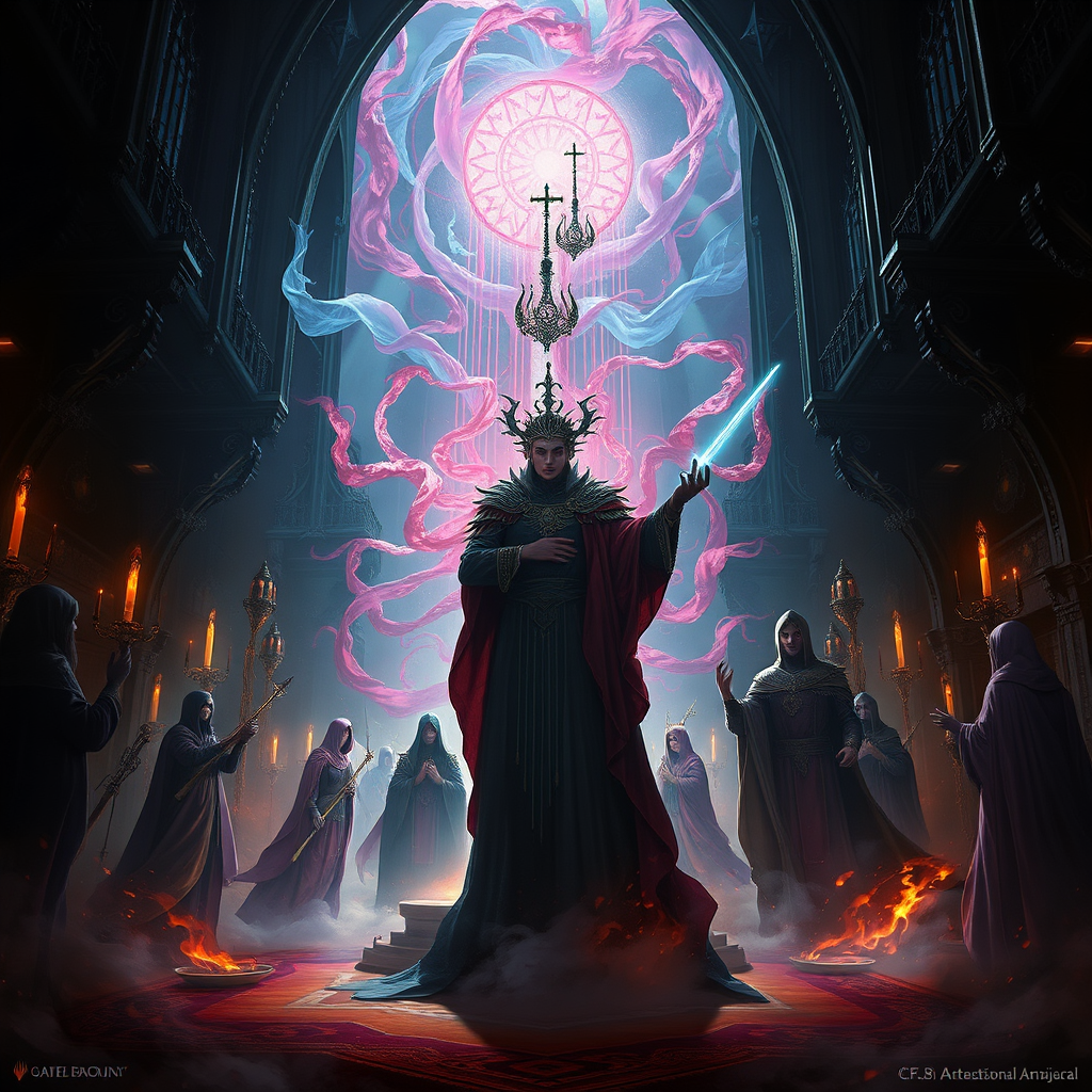 A regal and shadowy scene inspired by Magic the Gathering, featuring a vibrant contrast of colors spiraling around ghostly figures within the vast halls of a dark, towering castle. The subject strikes a majestic pose amidst dramatic shadows and intricate, ominous elements reminiscent of ArtStation's finest art. Orthodox symbolism weaves through the ambient atmosphere, enriched by emotional tribal dark fantasy themes and detailed ambient occlusion, culminating in a mesmerizing and intricate tableau.