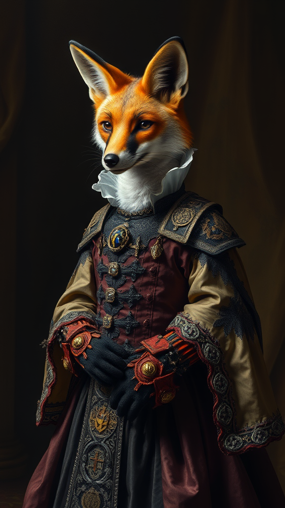 A regal anthropomorphic fox adorned in an elaborate medieval dress stands poised against a shadowy backdrop, evoking the style of Peter Morbacher, Anthony Van Dyck, Aleksi Briclot, and Alexandre Cabanel. The creature's garments are intricately detailed with gothic motifs, lending an air of mysterious sophistication. The fox's eyes glimmer with intelligence, its fur meticulously textured, and every fold of its clothing rendered with exquisite care. The scene is enveloped in a rich, dark atmosphere, reminiscent of classic portraiture, yet infused with a modern twist of fantasy, evoking a sense of timeless elegance and mystique.