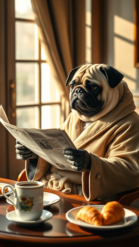 A regal anthropomorphic pug dog, clad in an elegant robe, leisurely enjoying breakfast while engrossed in a newspaper. Set in a sunlit room, the scene captures cinematic richness with soothing tones and intricate details. The atmosphere is serene, with soft shadows and low contrast highlighting the pug's expressive face and the texture of its robe. A steaming cup of coffee and a plate of croissants rest on the table, completing this peaceful morning ritual.