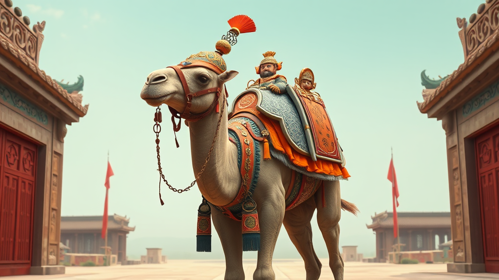 A regal camel adorned in an Ancient Chinese theme with orange and grey armor and a traditional helmet, standing majestically in the Mausoleum of the First Qin Emperor. The scene captures the intricate artistry reminiscent of Xu Beihong, featuring influences from appropriation artist Moosa Al Halyan. The setting is depicted in a realistic style, highlighting rich cyan tones and arabesque scroll patterns. The composition is densely detailed, reminiscent of wimmelbilder artworks, with an 8k high-render quality, presented in a 9:16 aspect ratio. The environment subtly incorporates elements of ancient Chinese architecture, with a creative infusion of whimsical historical motifs.