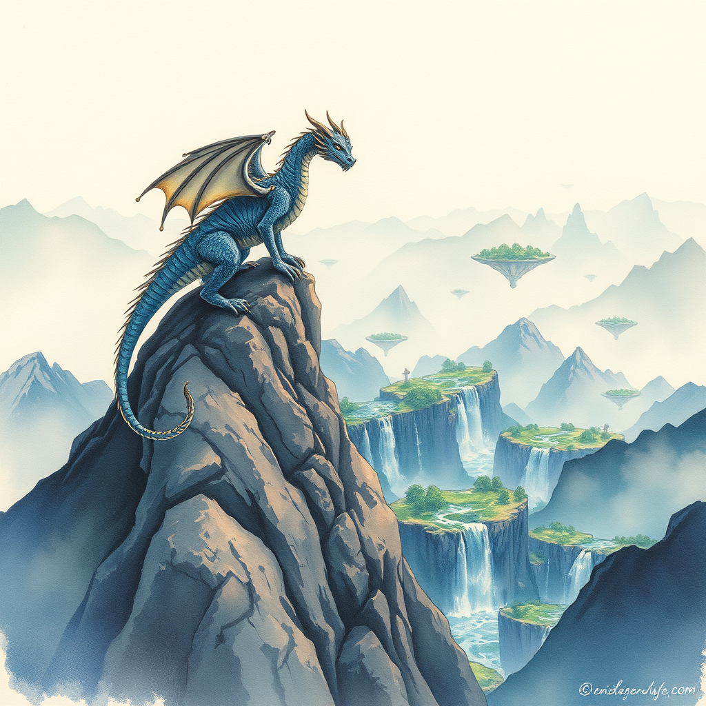 A regal Dragon rests atop a rugged mountain peak, gazing upon an enchanting valley adorned with drifting islands and cascading waterfalls. The landscape is bathed in the ethereal glow of bioluminescent flora, casting an aura of timeless mystery and awe. Created in delicate watercolors on textured paper, this scene captures an otherworldly realm where nature and magic intertwine.
