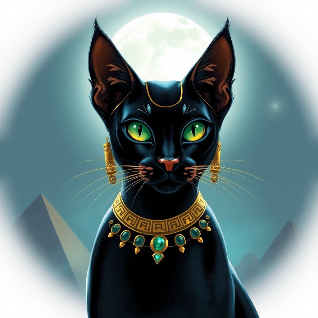A regal feline deity with the grace of a panther and the wisdom of ages, Bastet embodies the gentle protector spirit of ancient Egypt. With a shimmering coat resembling polished onyx and eyes like bright emeralds, she watches over the night with an enigmatic elegance. Guardian of hearth and home, she dances under moonlit skies, balancing the duality of a fierce warrior and nurturing mother, her presence a harmonious blend of ferocity and tenderness. Her aura captures the whispers of desert winds and the secrets of timeless pyramids, inspiring awe and reverence in those who seek her favor.