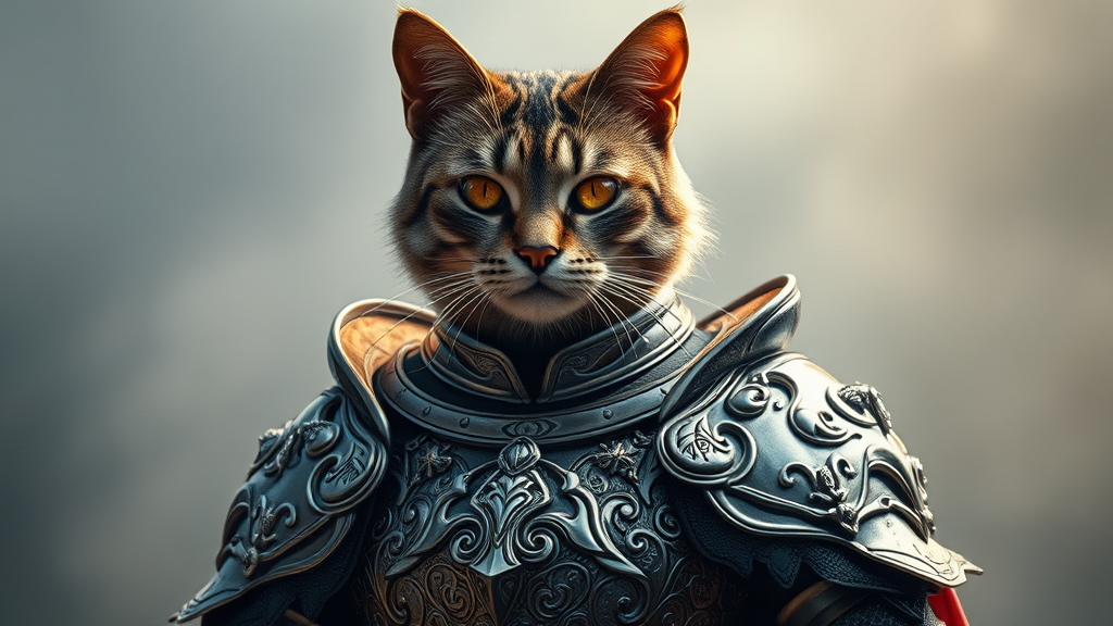 A regal feline warrior stands poised, its armor gleaming with silver intricacy under cinematic lighting. Each piece of the finely detailed armor boasts elaborate designs, interwoven with luxurious silk accents that add a touch of elegance to the formidable suit. The cat knight's piercing gaze exudes both wisdom and strength, captured in stunning 4k resolution. A soft atmospheric background enhances the image, casting subtle shadows that accentuate the knight's features, capturing the essence of this noble guardian with gentle creativity.