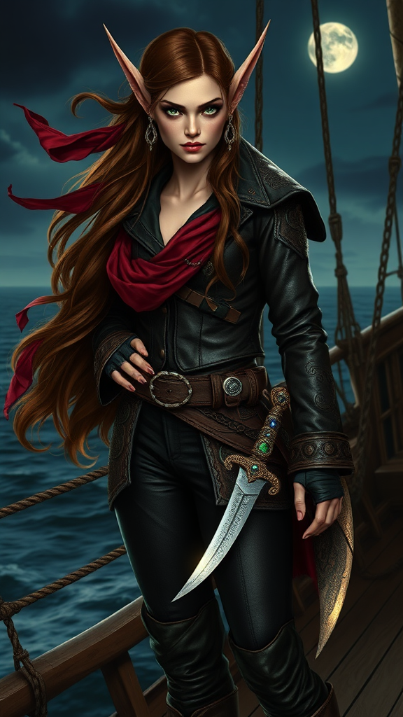 A regal female elf pirate stands confidently on the deck of her ship, her sharp, pointed ears adorned with gold and silver piercings, glistening under the moonlight. Her long, wavy hair, a cascade of deep mahogany, is partially tied back with a crimson silk scarf fluttering in the sea breeze. Her emerald eyes, capturing the mystery of the ocean, are accentuated with kohl, giving her an air of enticing danger. She wears a fitted leather jacket, the dark brown material intricately embroidered with swirling patterns reminiscent of elven design, paired with high-waisted, black trousers tucked into knee-high, weathered boots. A jeweled cutlass hangs at her side, its hilt encrusted with sapphires and emeralds that catch the faint light. Her stance is one of authority and grace, a blending of elegance with a rebellious spirit, embodying the essence of a mythical sea captain whose legend inspires tales across both land and sea.