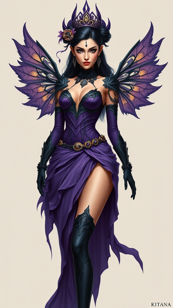 A regal figure of a goddess-like woman named Kitana, adorned in a luxurious ensemble of purple and black with a short, elegant skirt. Her charismatic presence is emphasized by her stunning features, including captivating large eyes and flawless, soft skin. Her attire is a fusion of fashion and fantasy, with an elaborate play on textures and details, embodying a mix of gothic and fantastical themes. The rendering is inspired by the artistry of Greg Rutkowski and Artgerm, characterized by intricate, highly detailed brushwork and a dynamic color palette. This concept art portrays her in a pose that exudes confidence and strength, set against a backdrop that highlights the triadic and complementary colors of her outfit. Designed in 8k resolution, the artwork aims for a balance of vivid realism and imaginative flair, resonating with gothic and fantasy art aficionados. Despite minor creative liberties, the depiction maintains harmonious proportions and anatomy, avoiding any deformations or inconsistencies.