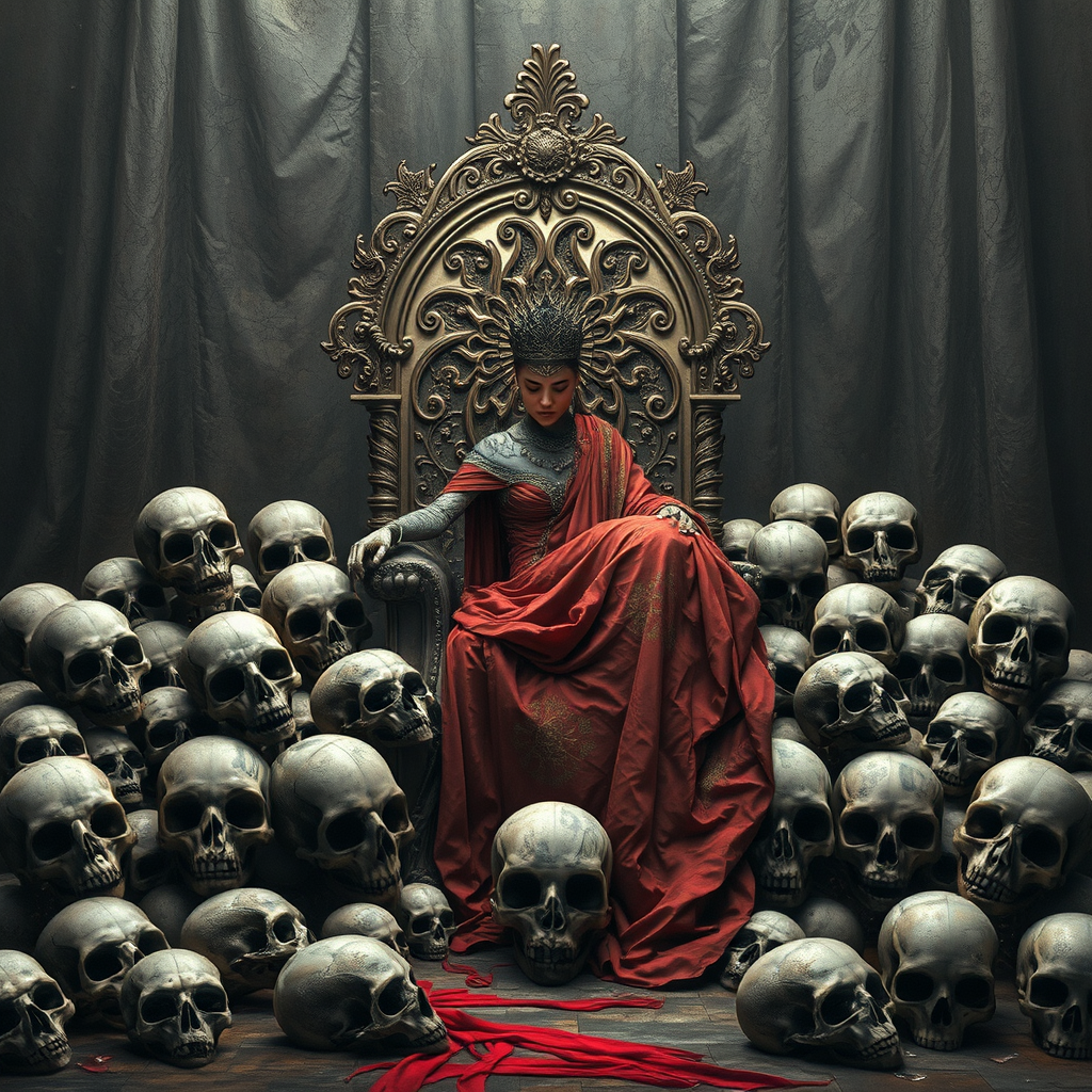 A regal figure reclines on an ornate throne, surrounded by an array of ancient, weathered skulls, rendered in the intricate style of Magali Villeneuve. The backdrop is a tapestry of dark silver and deep crimson hues, adding a dramatic contrast to the scene. Echoes of Shilin Huang's aesthetic weave through the apocalyptic art landscape, amplifying the sense of both beauty and desolation. The composition celebrates the graceful curvature of lines and forms, reminiscent of Dansaekhwa's minimalist elegance. Elements of Adonna Khare's detailed and surreal imagery are subtly integrated, creating a mesmerizing interplay between the imagined and the real.