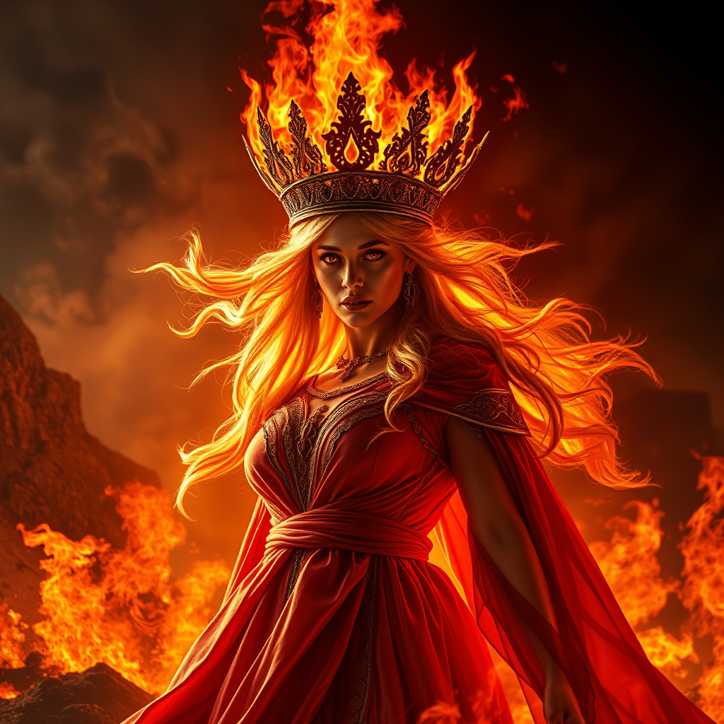A regal figure with a fiery aura, her crown a magnificent blaze of dancing flames, photorealistic in detail, set against a backdrop of swirling embers and dramatic lighting that casts intense shadows, her eyes glowing with the fierce intensity of a queen commanding the element of fire, her flowing gown ignited with hints of smoldering cinders, an embodiment of strength and power, standing amidst a landscape scorched by her fiery reign.