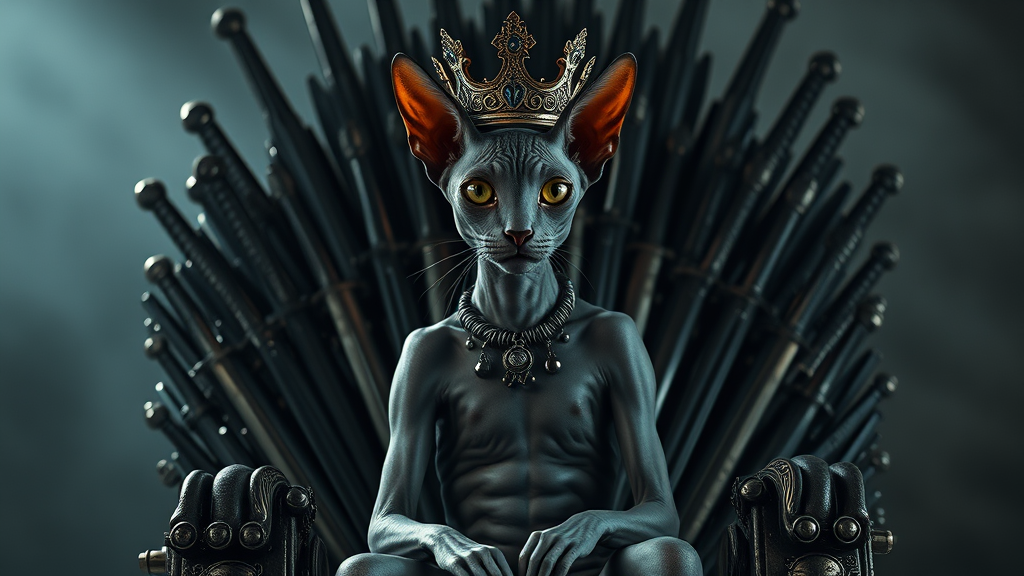 A regal hairless sphinx cat embodies the essence of Queen Cersei, adorned with an ornate crown, seated majestically on a throne forged from countless intertwining swords. The setting exudes an air of power, with dramatic cinematic lighting casting striking shadows and highlighting the feline's intense gaze. The scene is rooted in photorealism, capturing every detail of the feline monarch's posture and the intricate metalwork of the sword throne, set against a slightly misty, atmospheric backdrop.