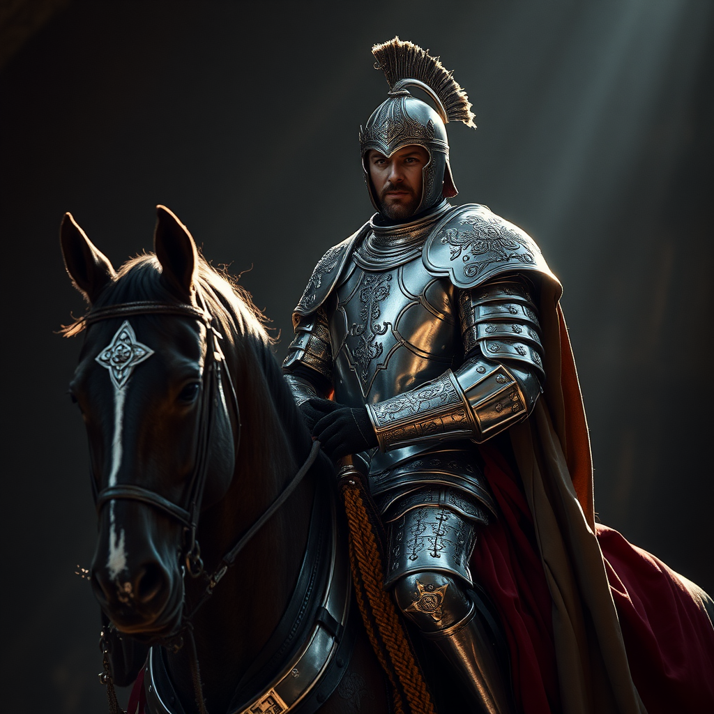 A regal horseman clad in exquisitely detailed armor sits majestically upon his noble steed. His armor, a masterful blend of silver and silk, glistens under the cinematic lighting. The intricate design of his protective gear catches the light, revealing patterns reminiscent of ancient artistry. Against a backdrop of dramatic shadows and highlights, the portrait captures the essence of chivalry and valor in breathtaking 4K clarity.