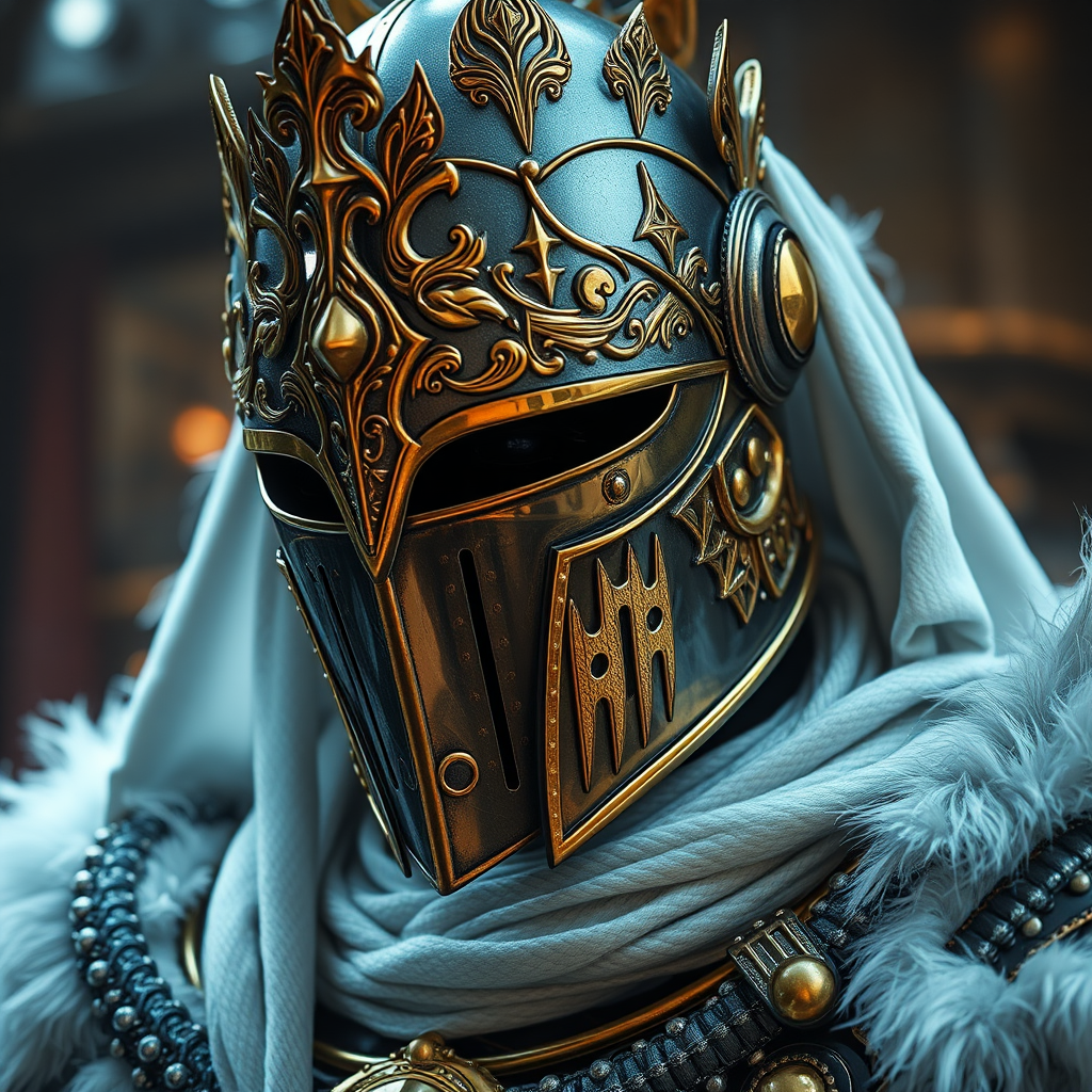 A regal knight adorned in intricate dark gold and pristine white armor, captured in the dynamic style of a scene rendered in Unreal Engine; close-up showcasing intense metallic finishes, infused with aurorapunk elements, set against a backdrop of cinematic grandeur; the atmosphere pulsates with vivid energy and rich texture, creating a dramatic, immersive visual experience reminiscent of a surreal furaffinity showcase.