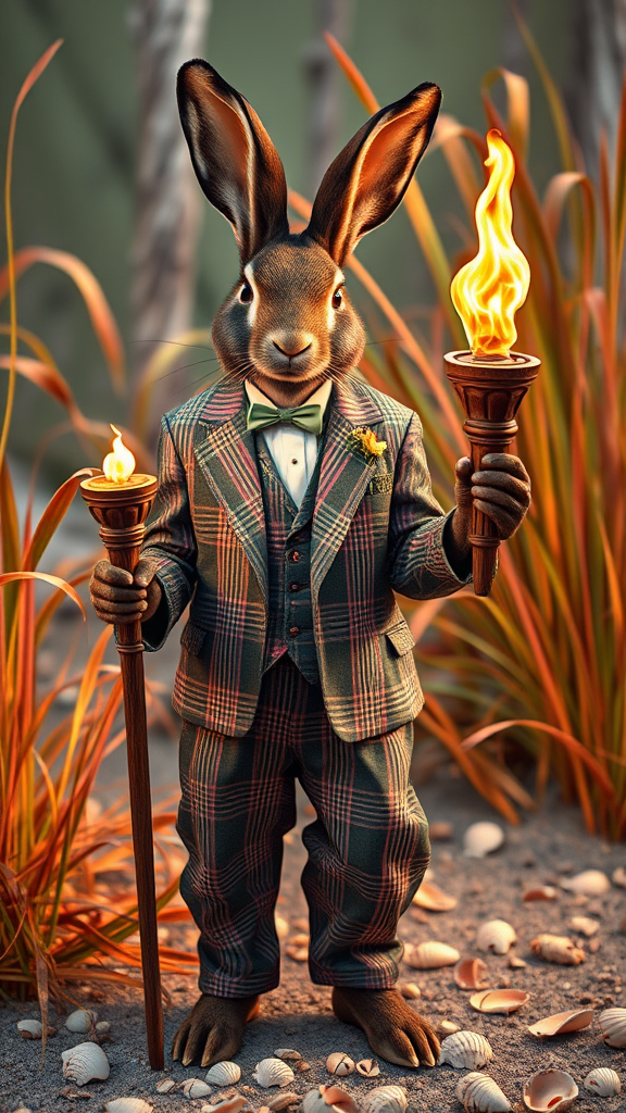 A regal Martinican rabbit clad in an elegant madras suit, embodying a blend of sophistication and fantasy, stands majestically. This humanoid figure holds a beautifully carved wooden torch that emits a gentle, warm glow. Set against a backdrop of vibrant, multicolored grasses and scattered conch shells, the scene is captured in a realistic yet fantastical style. With epic composition and intricate detail, soft movie lighting highlights the rabbit's graceful features and the rich textures of the landscape, evoking the spirit of a mythical queen in an enchanting realm.