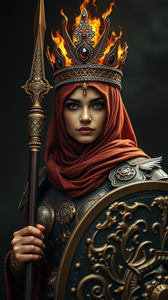 A regal Muslim queen of fire, adorned in a Hijab scarf, her crown ablaze with intricate golden and diamond flames. She stands facing the camera, her expression fierce and resolute. Photorealistic and epic in portrayal, her dramatic lighting accentuates the finely detailed armor. She holds a spear and shield, both showcasing intricate designs. The scene is ultra-realistic, with high detail quality and a cinematic ambiance. Her presence is captured with photography lighting that uses overcast reflection mapping. This hyper-realistic imagery employs octane rendering, enhanced by real shadows, depth of field, and VFX post-production techniques. The RTX ray tracing lighting elevates the scene to movie-quality rendering, capturing her in focused precision, 8k resolution, in a portrait aspect of 9:16.